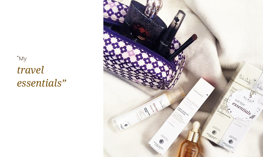 The one thing I have no problems with is my cosmetic bag. Always full, sometimes even with unneccesary cosmetics, but with carefully selected makeup. For this trip I will not go overboard... my favourite parfume YSL Opium, Naked2 eye shadow palette, Grandiose mascara, Dior liquid foundation and Pupa pink blush! Enough for a small cosmetics bag:) But one thing I will definitelly not leave behind are my face and hand creams. Alavi Winter essentials pack will be in my hand bag for the day look, Alavi Radiant Serum and Night cream for my beauty sleep and my Recovery cream for the morning. Whatever the weather, I do not want my skin to feel the sudden changes... and I want to keep my beauty routine when travelling. To breathe in fully... nurtured, well rested and healthy.