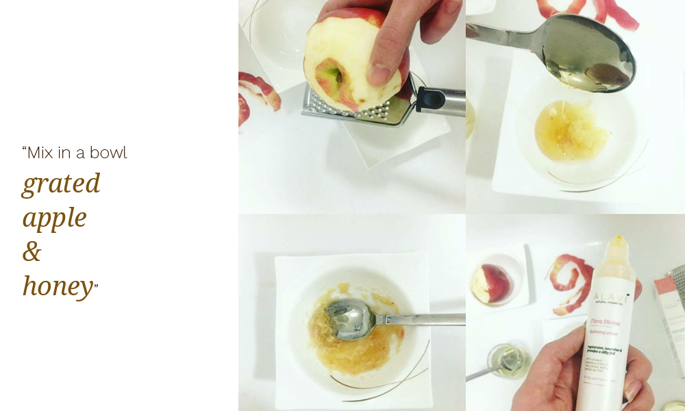 Peel and grate the apple. Put in a bowl a spoon of honey, add as spoon of grated apple. Mix togeter and apply on your face. Keep it on your face for 10 minutes and after rinse with warm water and towel dry. At the end feed the skin with the Flora Divina Hydrating cream with Kukui oil! Voila! Your skin is perfect.