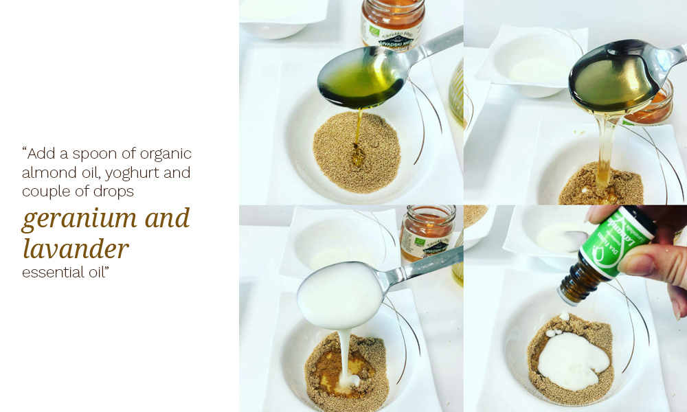 In this mixture add a spoon of organic almond oil, yoghurt and couple of drops of lavander and geranium essential oil. Stir all together. Apply the peeling massaging the skin of the face and neckline gently with circular movements for about 30 seconds.